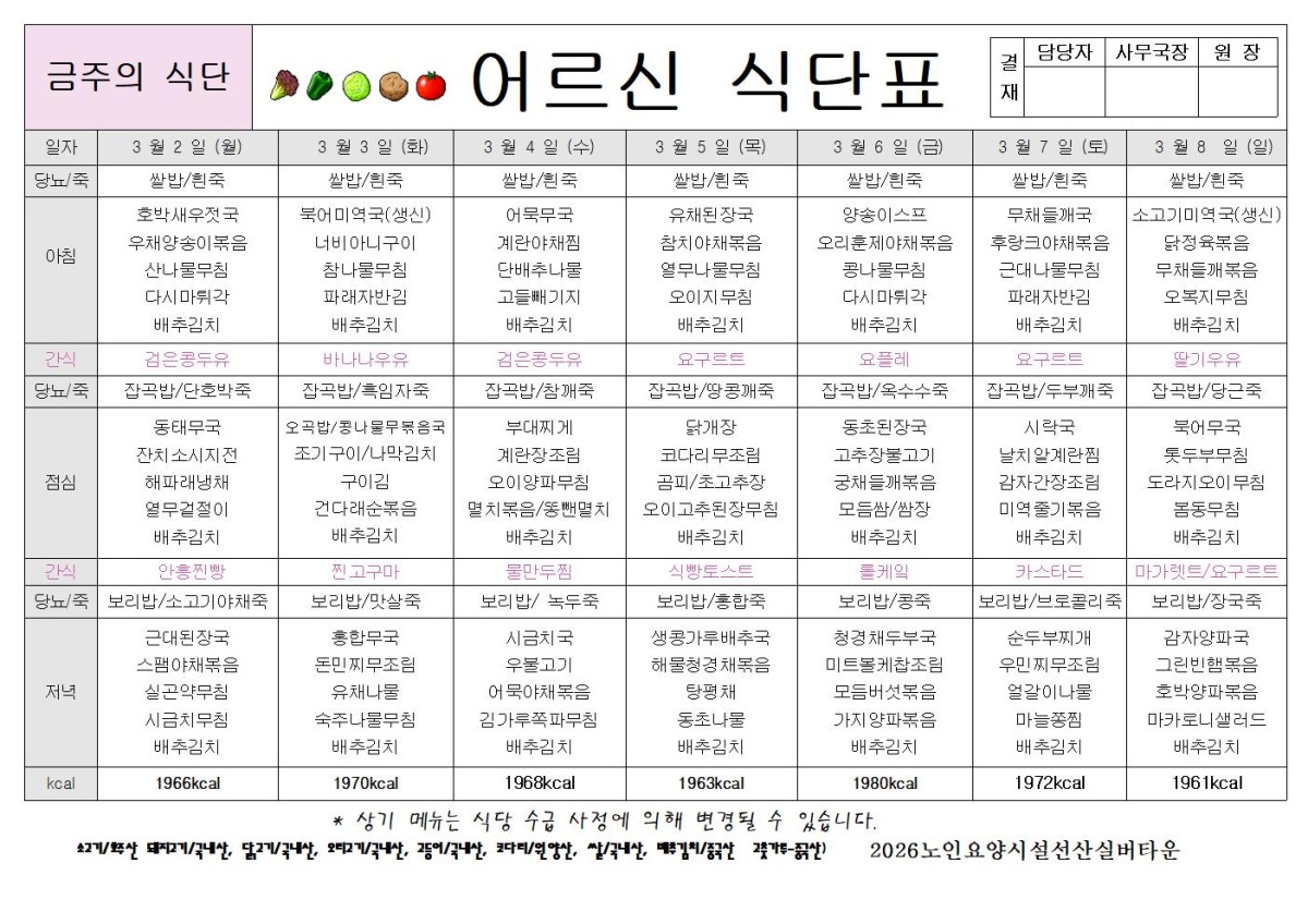 2026년 3월 1주 식단표 공지 합니다. 페이지 정보 작성자선산실버타운 등록일 2026-02-27 16:03 조회522 본문 2026년 3월 1주 식단표 공지 합니다.즐거운 주말 보내세요^^ 목록 이전글2026년 3월 2주 식단표 공지 합니다. 26.03.06 다음글2026년 2월 4주 식단표 공지합니다. 26.02.20