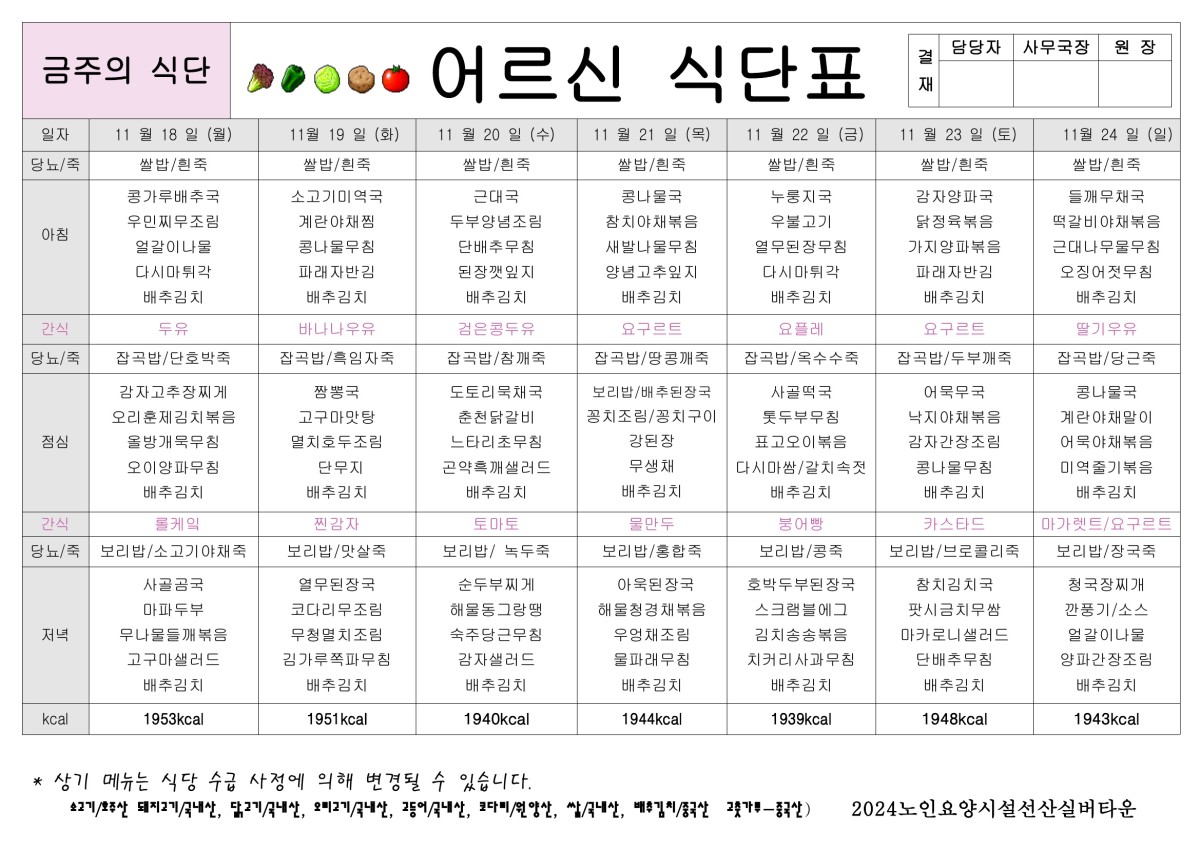 11월 3주 식단표 올려드립니다. 페이지 정보 작성자선산실버타운 등록일 2024-11-15 00:00 조회427 본문 11월 3주 식단표 올려드립니다. 목록 이전글11월 4주 식단표 올려드립니다. 24.11.22 다음글11월 2주 식단표 올려드립니다. 24.11.08