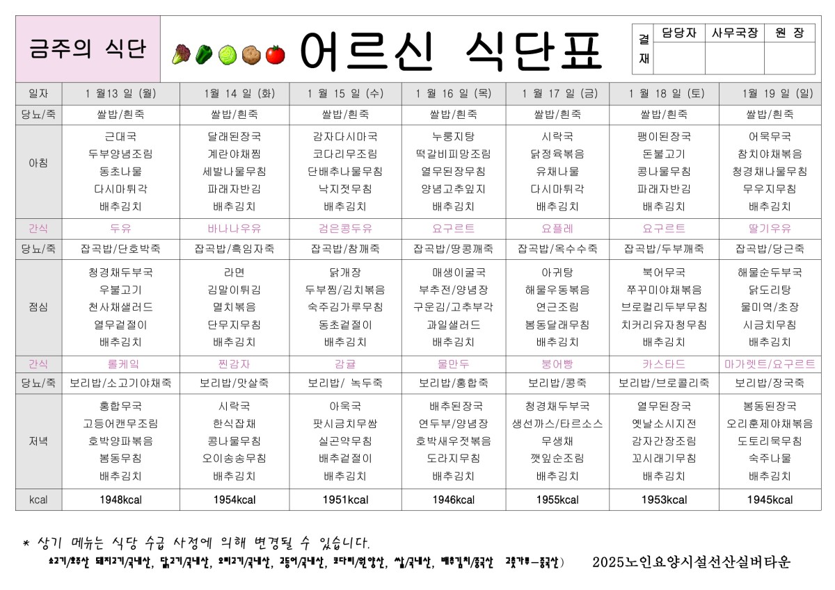 1월 3주 식단표 올려드립니다. 페이지 정보 작성자선산실버타운 등록일 2025-01-10 00:00 조회416 본문 1월 3주 식단표 올려드립니다. 목록 이전글1월 4주 식단표 올려드립니다. 25.01.17 다음글1월 2주 ㅣ식단표 올려드립니다. 25.01.03