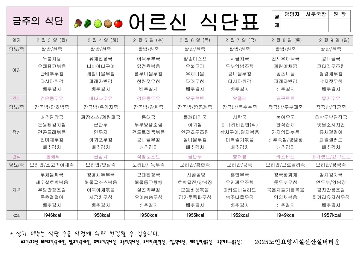 2월 1주 식단표올려드립니다. 페이지 정보 작성자선산실버타운 등록일 2025-01-31 00:00 조회403 본문 2월 1주 식단표올려드립니다. 목록 이전글2월 2주 식단표 올려드립니다. 25.02.07 다음글1월 5주 식단표 올려드립니다. 25.01.24
