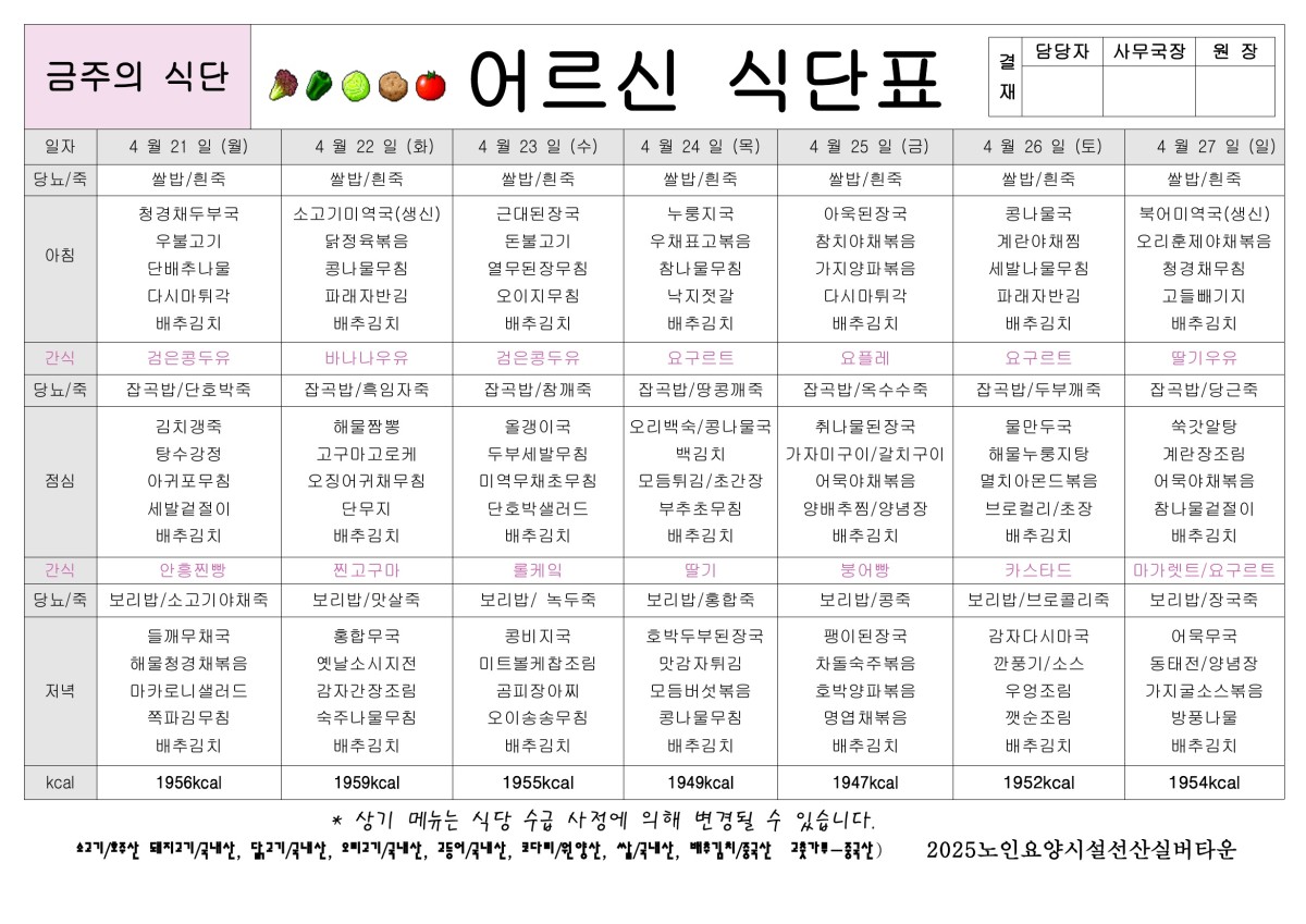 4월 4주 식단표 올려드립니다. 페이지 정보 작성자선산실버타운 등록일 2025-04-18 00:00 조회410 본문 4월 4주 식단표 올려드립니다. 목록 이전글5월 1주 식단표 올려드립니다 25.04.25 다음글4월 3주 식단표 올려드립니다 25.04.11
