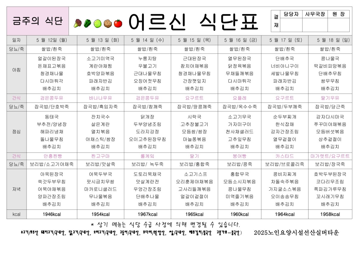 5월 3주 식단표 올려드립니다. 페이지 정보 작성자선산실버타운 등록일 2025-05-09 00:00 조회415 본문 5월 3주 식단표 올려드립니다. 목록 이전글5월 4주 식단표 올려드립니다. 25.05.16 다음글5월 2주 식단표 올려드립니다. 25.05.02