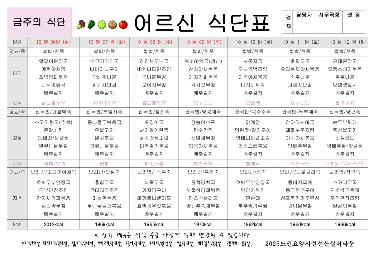 10월 2주 식단표 공지합니다. 페이지 정보 작성자선산실버타운 등록일 2025-10-02 00:00 조회447 본문 10월 2주 ㅣ식단표 올려드립니다. 목록 이전글10월 3주 식단표 공지합니다. 25.10.10 다음글10월 1주 식단표 공지합니다. 25.09.26