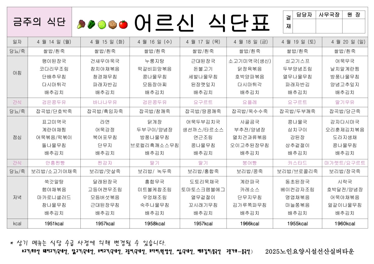 4월 3주 식단표 올려드립니다 페이지 정보 작성자선산실버타운 등록일 2025-04-11 00:00 조회405 본문 4월 3주 식단표 올려드립니다 목록 이전글4월 4주 식단표 올려드립니다. 25.04.18 다음글4월 2주 식단표 올려드립니다. 25.04.04