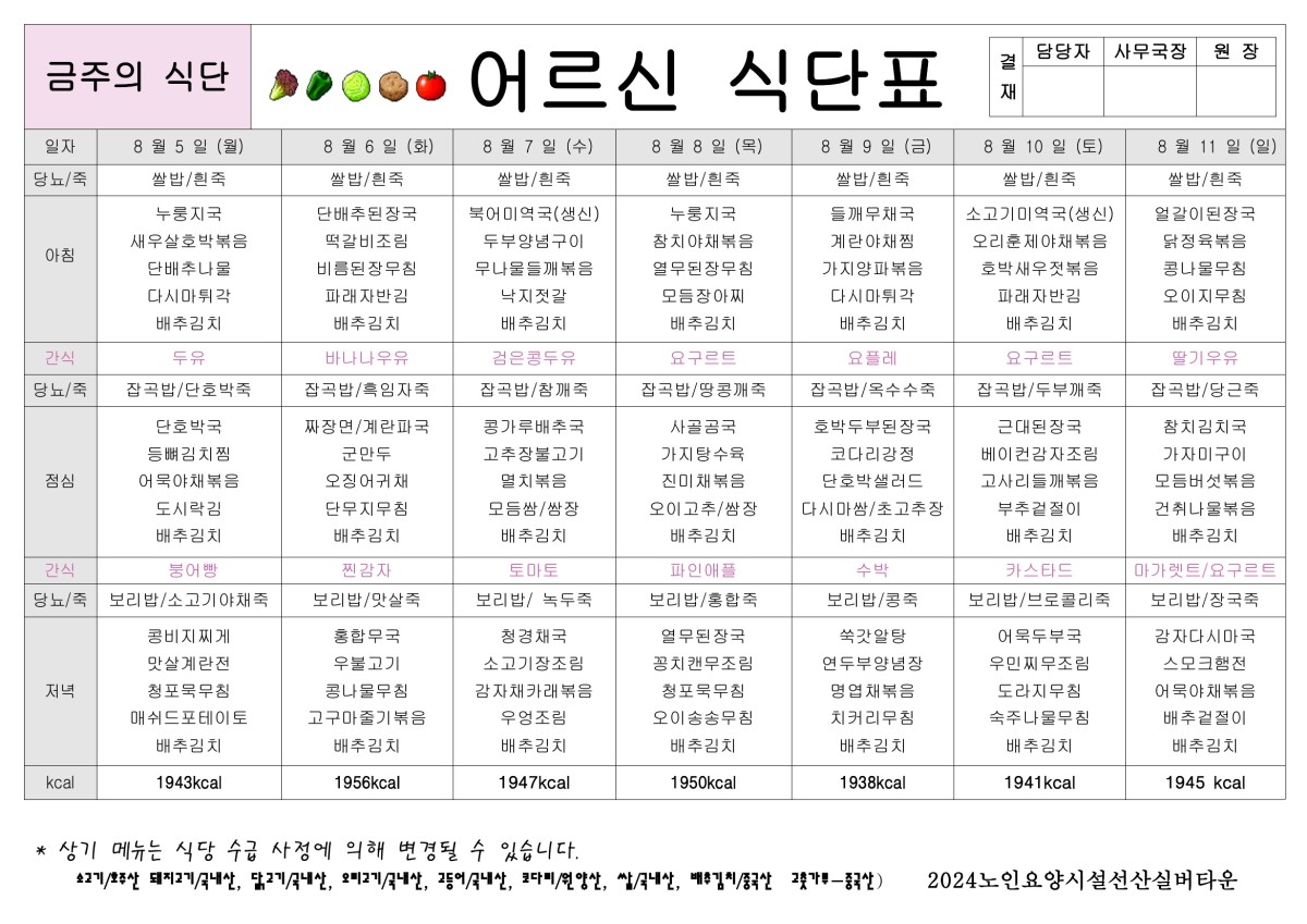 8월 1주 식단표 올려드립니다. 페이지 정보 작성자선산실버타운 등록일 2024-08-02 00:00 조회1,121 본문 8월 1주 식단표 올려드립니다. 목록 이전글8월 2주 식단표 올려두립니다. 24.08.09 다음글7월 5주 식단표 올려드립니다. 24.07.26