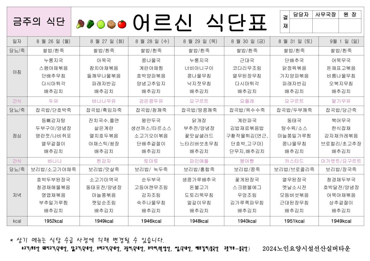 8월 4주 식단표 올려드립니다. 페이지 정보 작성자선산실버타운 등록일 2024-08-23 00:00 조회1,108 본문 8월 4주 식단표 올려드립니다. 목록 이전글9월 1주 식단표 올려드립니다. 24.08.30 다음글8월 3주 식단표 올려드립니다. 24.08.16