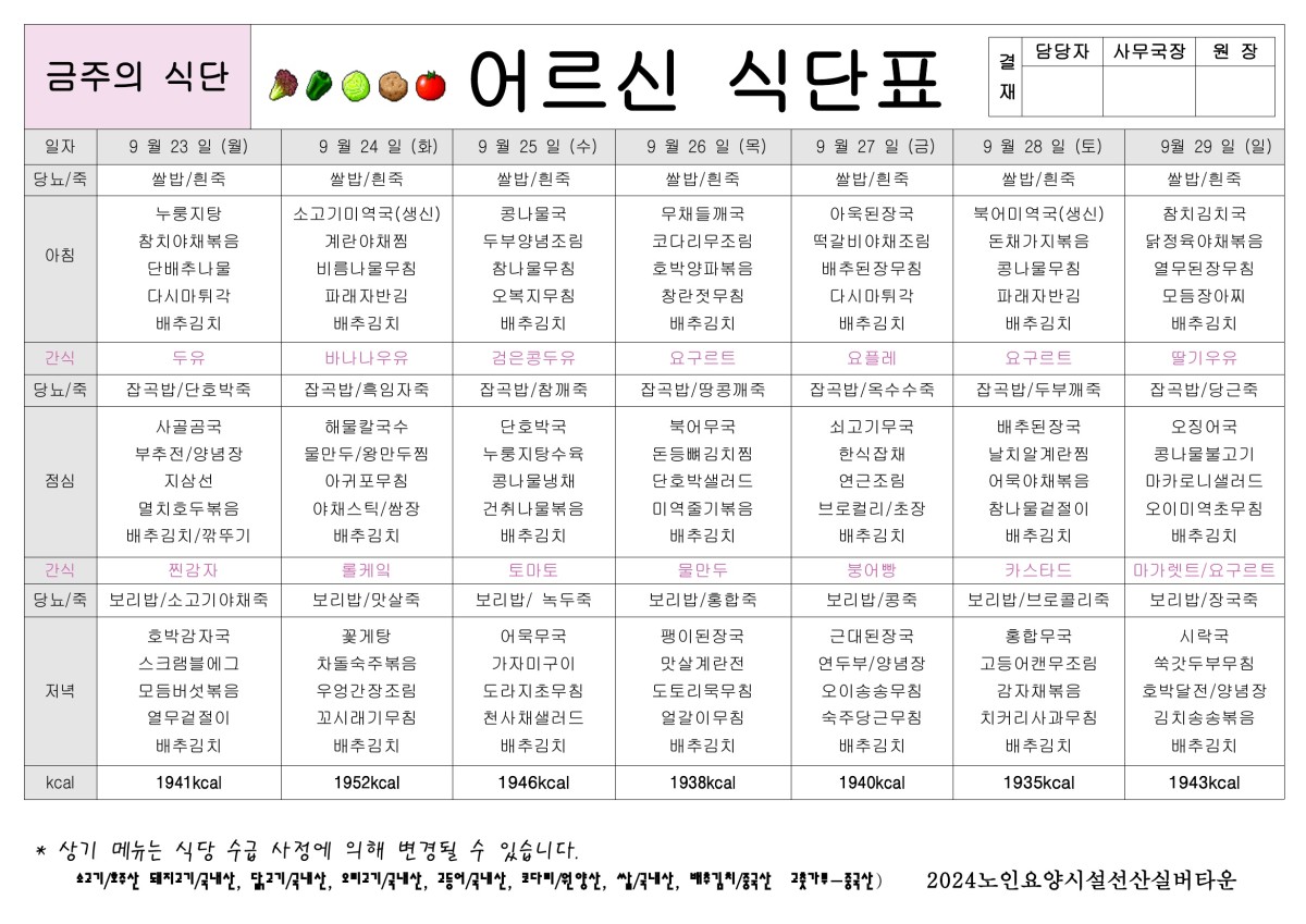 9월 4주 식단표 올려드립니다. 페이지 정보 작성자선산실버타운 등록일 2024-09-20 00:00 조회1,122 본문 9월 4주 식단표 올려드립니다. 목록 이전글10월 1주 식단표 올려드립니다. 24.09.27 다음글9월 3주 식단표 올려드립니다. 24.09.13