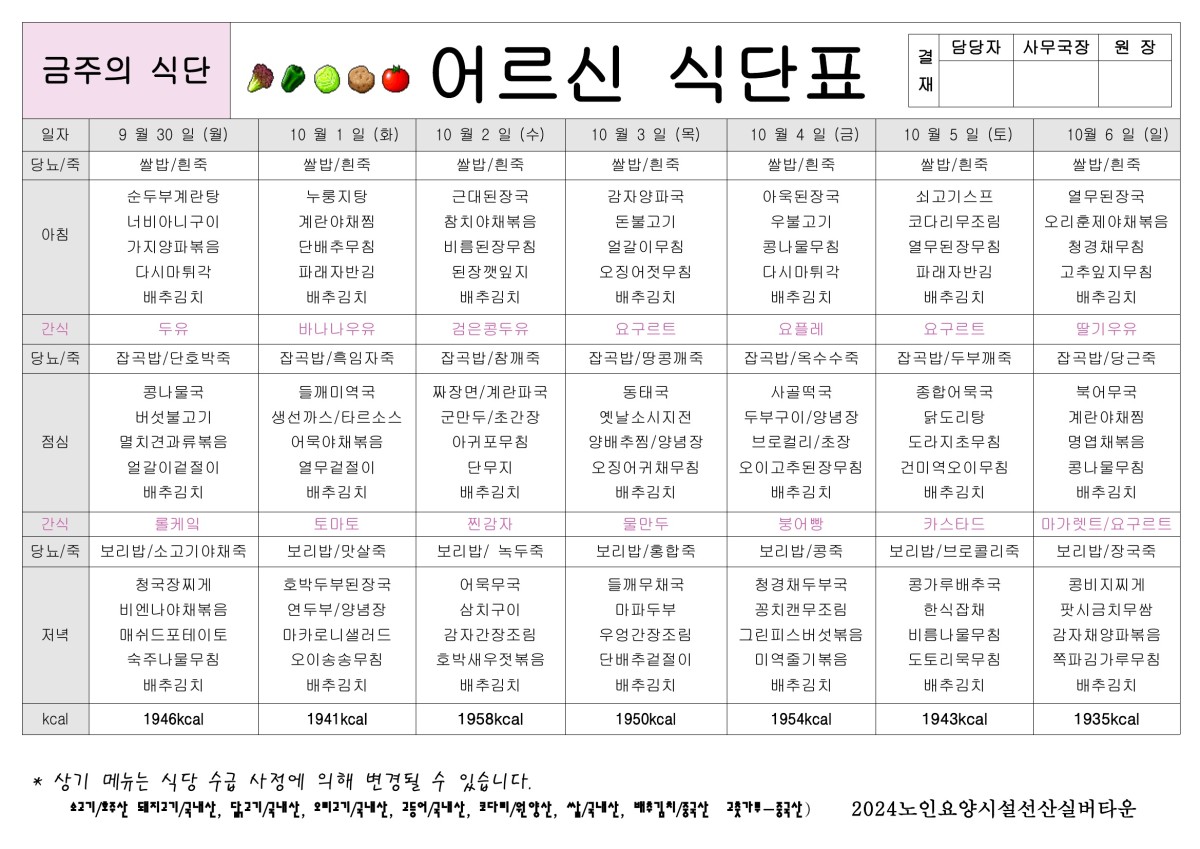 10월 1주 식단표 올려드립니다. 페이지 정보 작성자선산실버타운 등록일 2024-09-27 00:00 조회1,154 본문 10월 1주 식단표 올려드립니다. 목록 이전글10월 2주 식단표 올려드립니다. 24.10.04 다음글9월 4주 식단표 올려드립니다. 24.09.20
