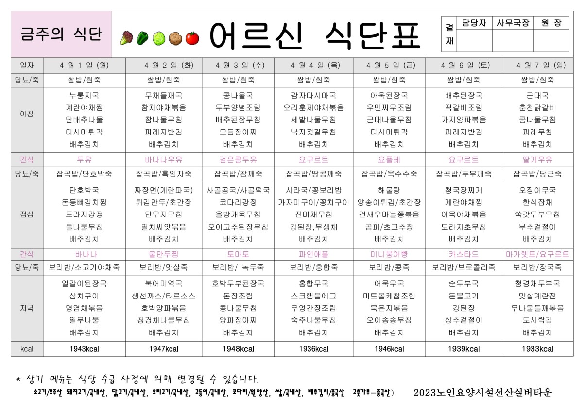 4월 1주 식단표 올려드립니다. 페이지 정보 작성자선산실버타운 등록일 2024-03-29 00:00 조회1,087 본문 4월 1주 식단표 올려드립니다. 목록 이전글4월 2주 식단표 올려드립니다. 24.04.05 다음글3월 4주 식단표 올려드립니다. 24.03.22
