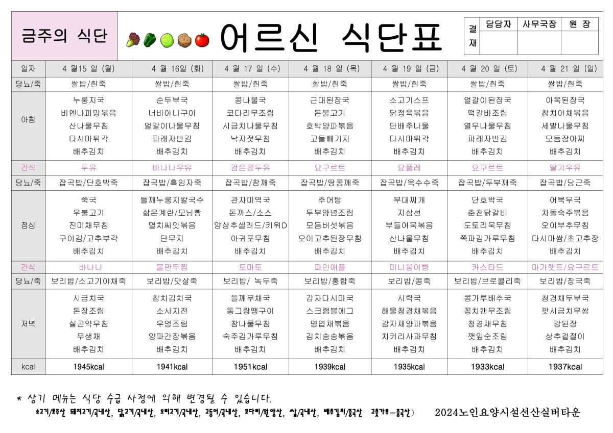 4월 3주 식단표 올려드립니다. 페이지 정보 작성자선산실버타운 등록일 2024-04-12 00:00 조회1,081 본문 4월 3주 식단표 올려드립니다. 목록 이전글4월 4주 식단표 올려 드립니다. 24.04.19 다음글4월 2주 식단표 올려드립니다. 24.04.05