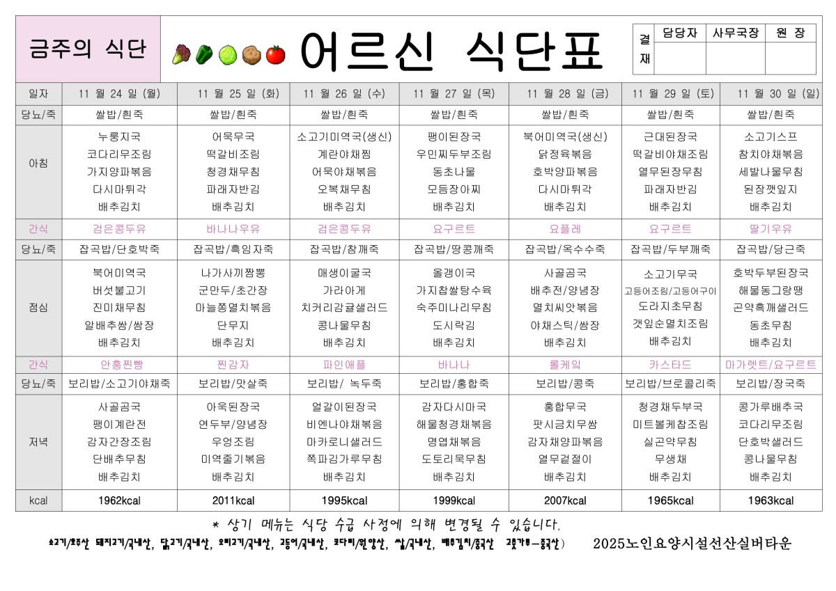 11월4주 식단표 올려드리니다. 페이지 정보 작성자선산실버타운 등록일 2025-11-21 00:00 조회415 본문 11월4주 식단표 올려드리니다. 목록 이전글12월 1주 식단표 공지합니다. 25.11.28 다음글11월 3주 식단표 올려드립니다. 25.11.14