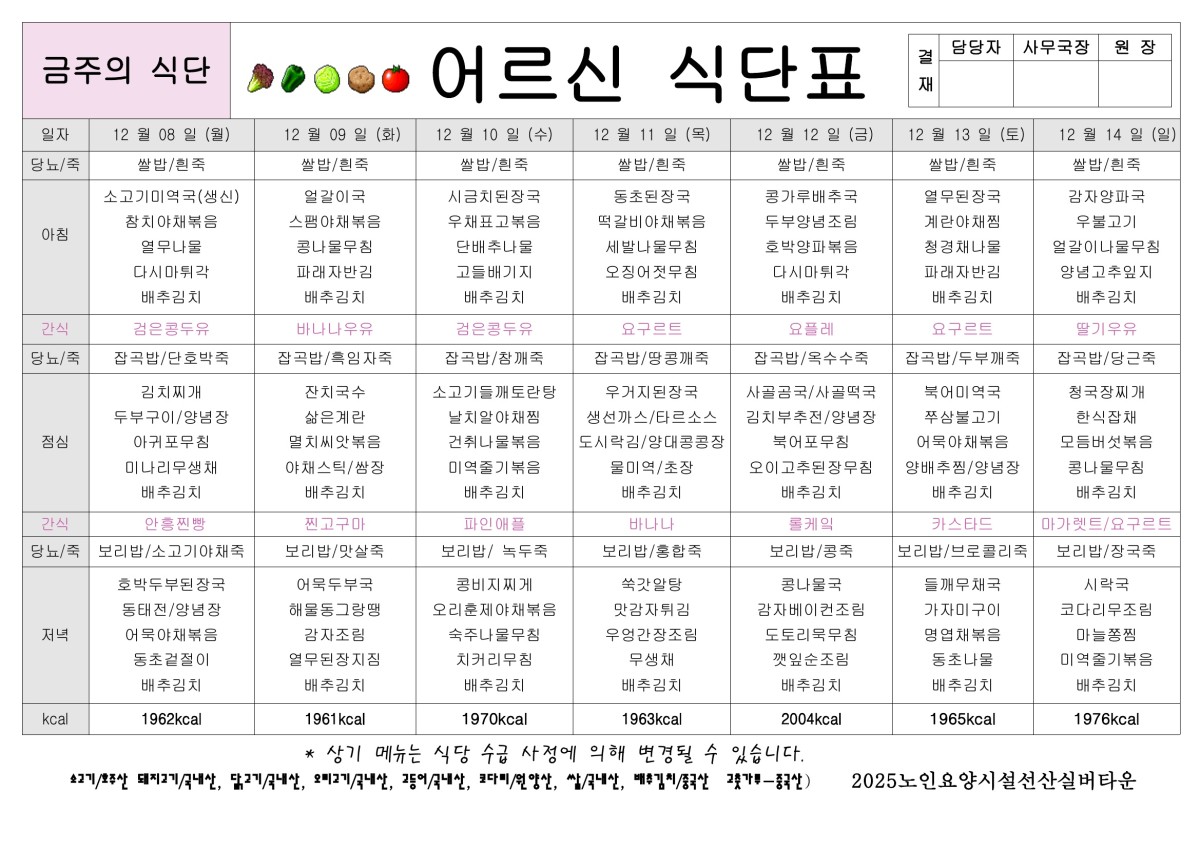 12월 2주 식단표 공지합니다. 페이지 정보 작성자선산실버타운 등록일 2025-12-05 00:00 조회393 본문 12월 2주 식단표 올려드립니다 목록 이전글12월 3주 식단표 공지합니다. 25.12.12 다음글12월 1주 식단표 공지합니다. 25.11.28