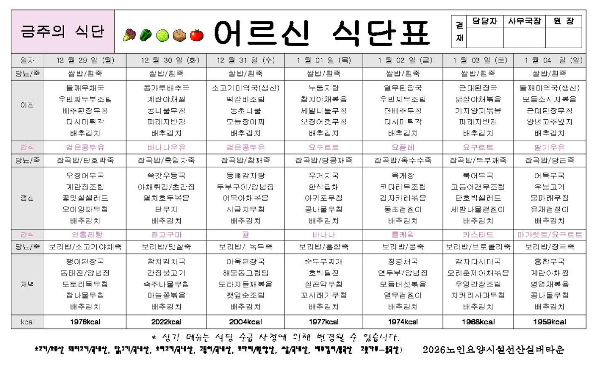 2026년 1월 1주 식단표 공지합니다. 페이지 정보 작성자선산실버타운 등록일 2026-01-02 17:15 조회314 본문 2026년 1월 1주 식단표 공지합니다. 즐거운 하루 보내세요^^ 목록 이전글2026년 1월 2주 식단표 공지합니다. 26.01.09 다음글12월 3주 식단표 공지합니다. 25.12.12