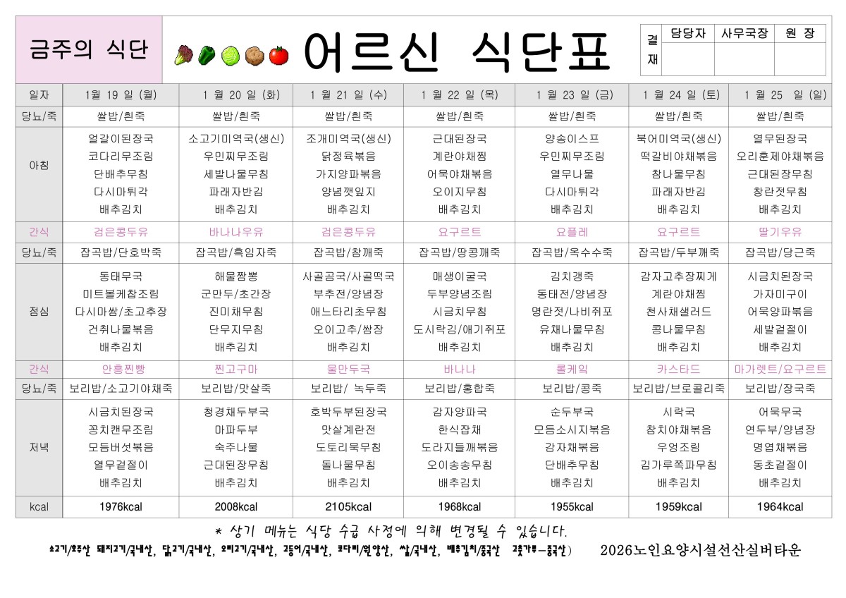 2026년 1월 4주 식단표 공지합니다. 페이지 정보 작성자선산실버타운 등록일 2026-01-16 16:05 조회225 본문 2026년 1월 4주 식단표 공지합니다. 즐거운 하루 보내세요^^ 목록 이전글2026년 1월 5주 식단표 공지합니다. 26.01.23 다음글2026년 1월 3주 식단표 공지합니다. 26.01.09