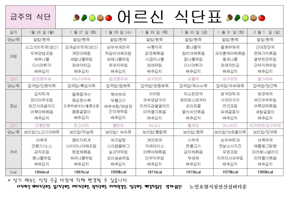 2026년 1월 5주 식단표 공지합니다. 페이지 정보 작성자선산실버타운 등록일 2026-01-23 13:02 조회155 본문 2026년 1월 5주 식단표 공지합니다. 즐거운 하루 되세요.^^ 목록 이전글2026년 2월 1주 식단표 공지합니다. 26.01.30 다음글2026년 1월 4주 식단표 공지합니다. 26.01.16