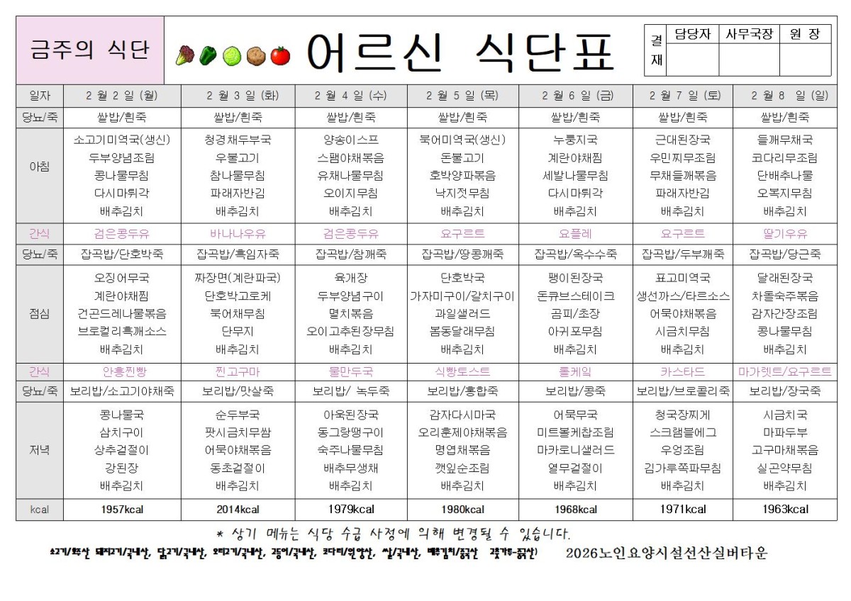 2026년 2월 1주 식단표 공지합니다. 페이지 정보 작성자선산실버타운 등록일 2026-01-30 13:53 조회108 본문 2026년 2월 1주 식단표 공지합니다. 좋은 하루 되세요. ^^ 목록 이전글2026년 2월 2주 식단표 공지합니다. 26.02.06 다음글2026년 1월 5주 식단표 공지합니다. 26.01.23