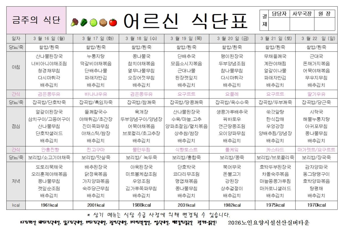 2026년 3월 3주 식단표 공지합니다..행복한 하루 되세요.^^ 페이지 정보 작성자선산실버타운 등록일 2026-03-13 17:30 조회382 본문 2026녕 3월 3주 식단표 공지합니다 . 목록 이전글2026년 3월 4주 식단표 공지합니다. 26.03.20 다음글2026년 3월 2주 식단표 공지 합니다. 26.03.06