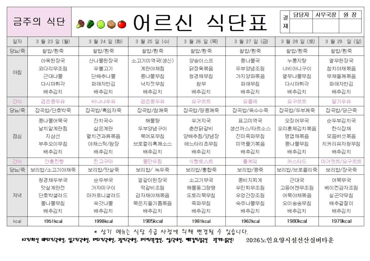 2026년 3월 4주 식단표 공지합니다. 페이지 정보 작성자선산실버타운 등록일 2026-03-20 14:28 조회355 본문 2026년 3월 4주 식단표 공지합니다. 즐거운 하루 되세요.^^ 목록 이전글2026년 4월 1 주 식단표 공지합니다. 26.03.25 다음글2026년 3월 3주 식단표 공지합니다..행복한 하루 되세요.^^ 26.03.13