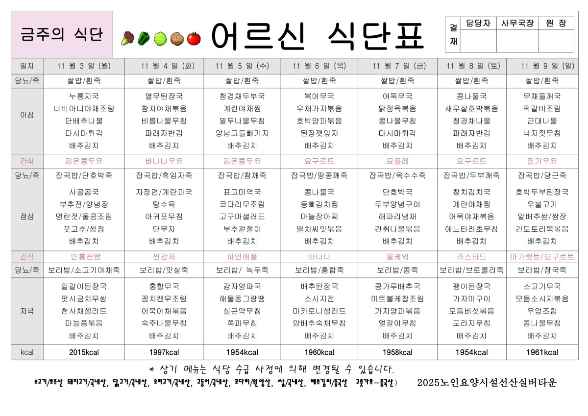 11월 1주 식단표 공지합니다. 페이지 정보 작성자선산실버타운 등록일 2025-10-31 00:00 조회453 본문 11월 1주 ㅣ식단표 올려드립니다. 목록 이전글11월 2주 식단표 올려드립니다. 25.11.07 다음글10월 5주 식단표 공지합니다. 25.10.24