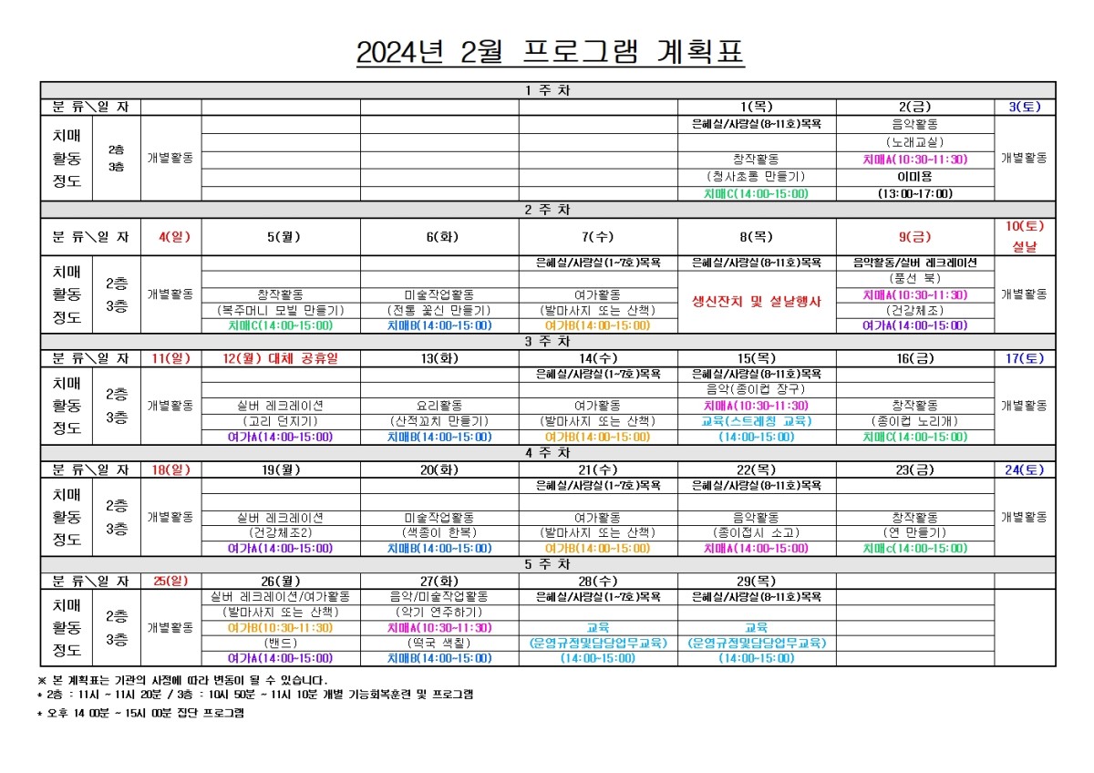 2024년 2월 프로그램 계획표 페이지 정보 작성자선산실버타운 등록일 2024-02-01 00:00 조회618 본문 목록 이전글2024년 3월 프로그램 계획표 24.02.29 다음글2024년 1월 프로그램 일정표 24.01.01