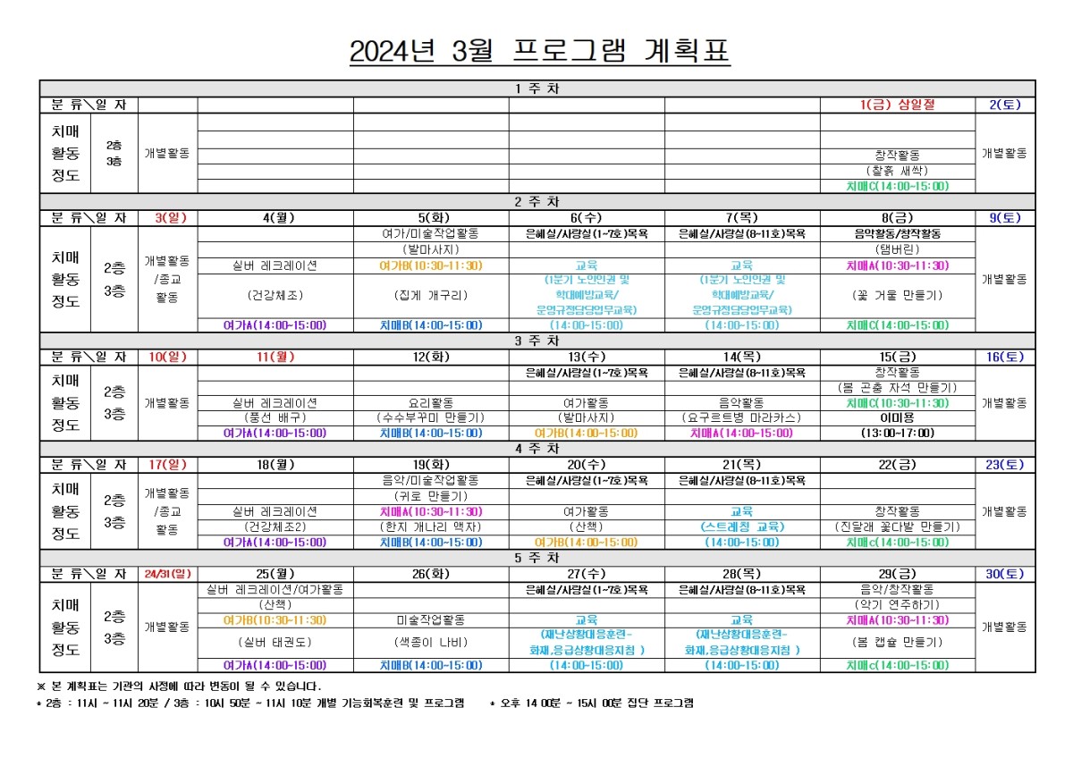 2024년 3월 프로그램 계획표 페이지 정보 작성자선산실버타운 등록일 2024-02-29 00:00 조회627 본문 목록 이전글2024년 4월 프로그램 계획표 24.03.29 다음글2024년 2월 프로그램 계획표 24.02.01