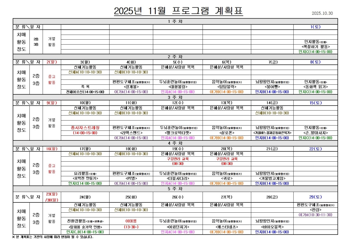 2025년 11월 프로그램 계획표 페이지 정보 작성자선산실버타운 등록일 2025-10-31 00:00 조회267 본문 2025년 11월 프로그램 계획표입니다. 즐거운 하루 보내세요^^ 목록 이전글2025년 12월 프로그램 계획표 25.12.01 다음글2025년 10월 프로그램 계획표 25.09.30