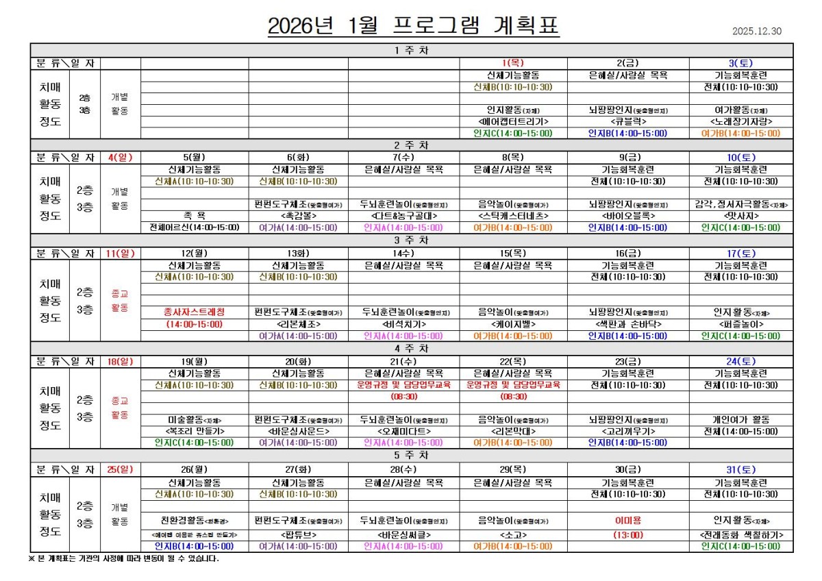 2026년 1월 프로그램 계획표 페이지 정보 작성자선산실버타운 등록일 2026-01-06 10:05 조회216 본문 2026년 1월 프로그램 계획표입니다. 즐거운 하루 보내세요^^ 목록 이전글2026년 2월 프로그램 계획표 26.02.02 다음글2025년 12월 프로그램 계획표 25.12.01