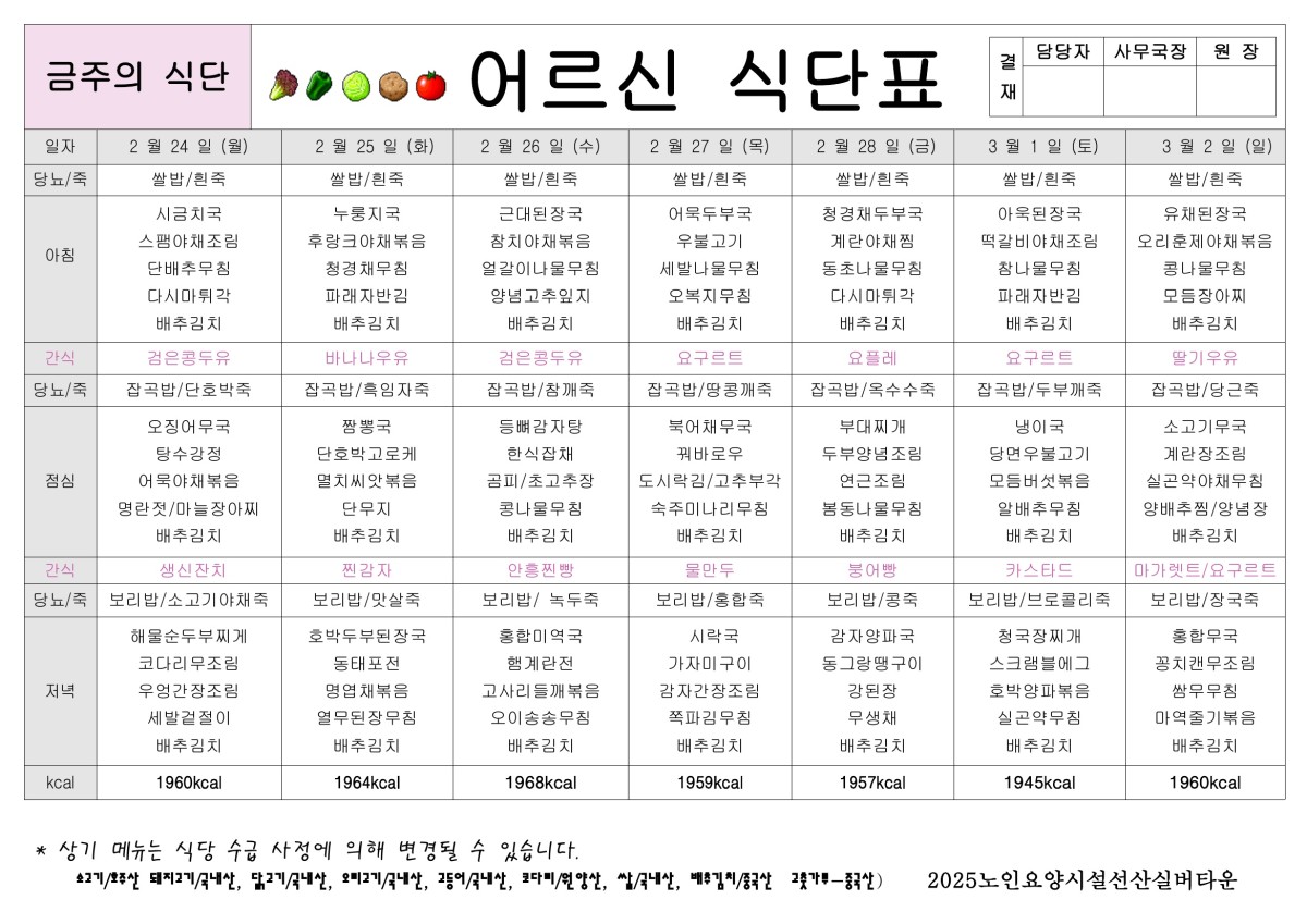 2월 4주 식단표 올려드립니다. 페이지 정보 작성자선산실버타운 등록일 2025-02-21 00:00 조회403 본문 2월 4주 식단표 올려드립니다. 목록 이전글3월1주 식단표 올려드립니다. 25.02.28 다음글2월 3주 식단표 올려드립니다. 25.02.14