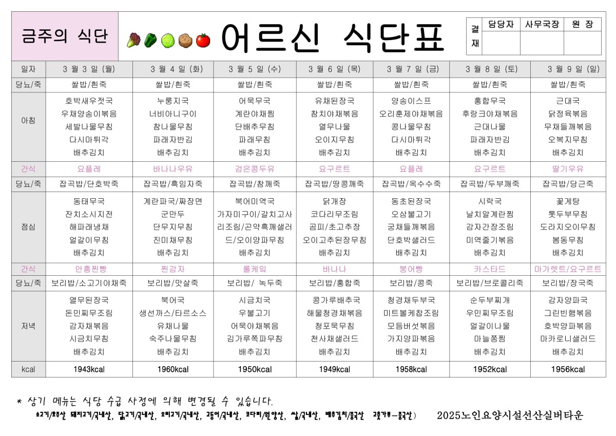 3월1주 식단표 올려드립니다. 페이지 정보 작성자선산실버타운 등록일 2025-02-28 00:00 조회400 본문 3월1주 식단표 올려드립니다. 목록 이전글3월2주 식단표 올려드립니다. 25.03.07 다음글2월 4주 식단표 올려드립니다. 25.02.21