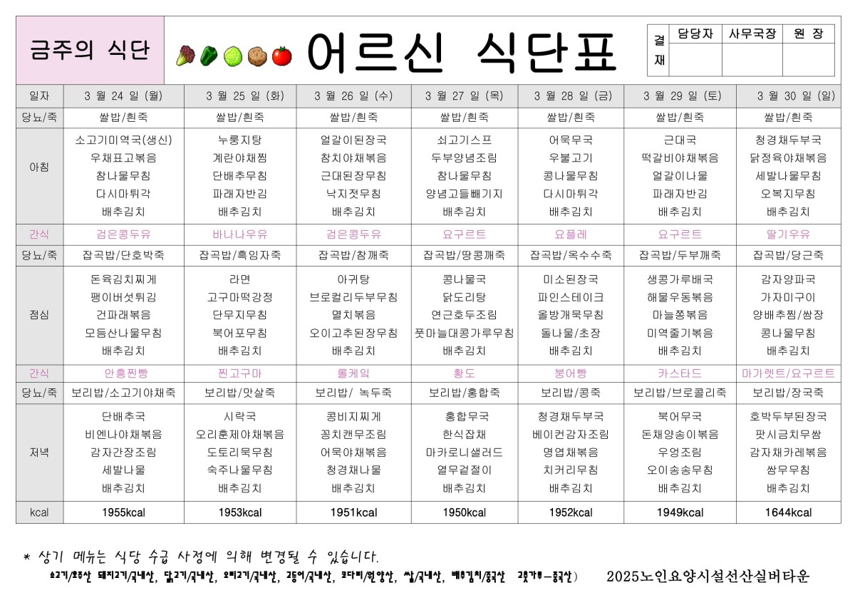 3월4주 식단표 올려드립니다. 페이지 정보 작성자선산실버타운 등록일 2025-03-21 00:00 조회397 본문 3월4주 식단표 올려드립니다. 목록 이전글4월 1주 식단표 올려드립니다. 25.03.28 다음글3월 3주 식단표 올려드립니다. 25.03.14