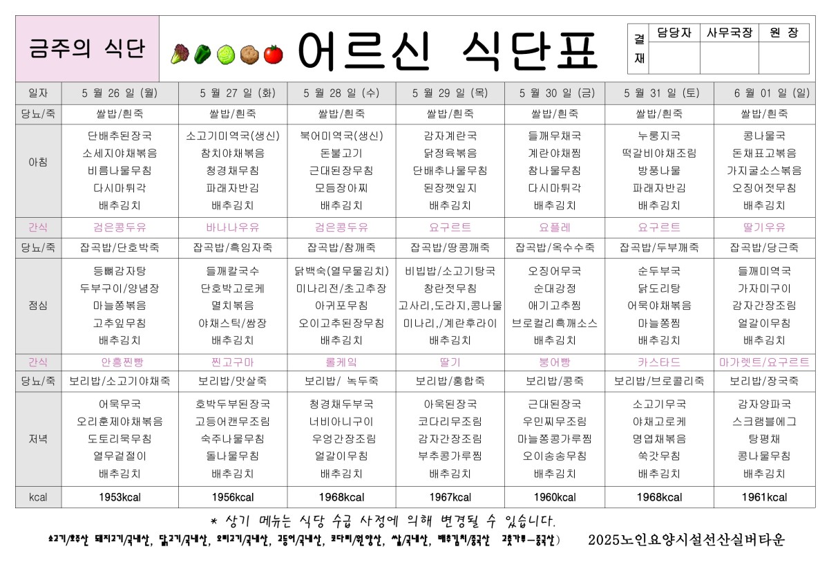 5월 5일 식단표 올려드립니다. 페이지 정보 작성자선산실버타운 등록일 2025-05-23 00:00 조회355 본문 5월 5일 식단표 올려드립니다. 목록 이전글6월 1주 식단표 올려드립니다. 25.05.30 다음글5월 4주 식단표 올려드립니다. 25.05.16