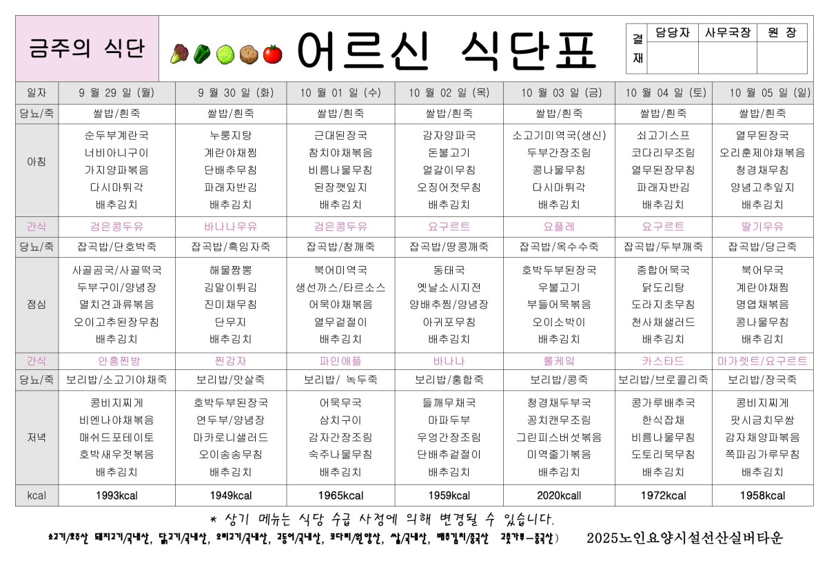 10월 1주 식단표 공지합니다. 페이지 정보 작성자선산실버타운 등록일 2025-09-26 00:00 조회385 본문 10월 1주 식단표 올려드립니다. 목록 이전글10월 2주 식단표 공지합니다. 25.10.02 다음글9월 4주 식단표 공지합니다. 25.09.21