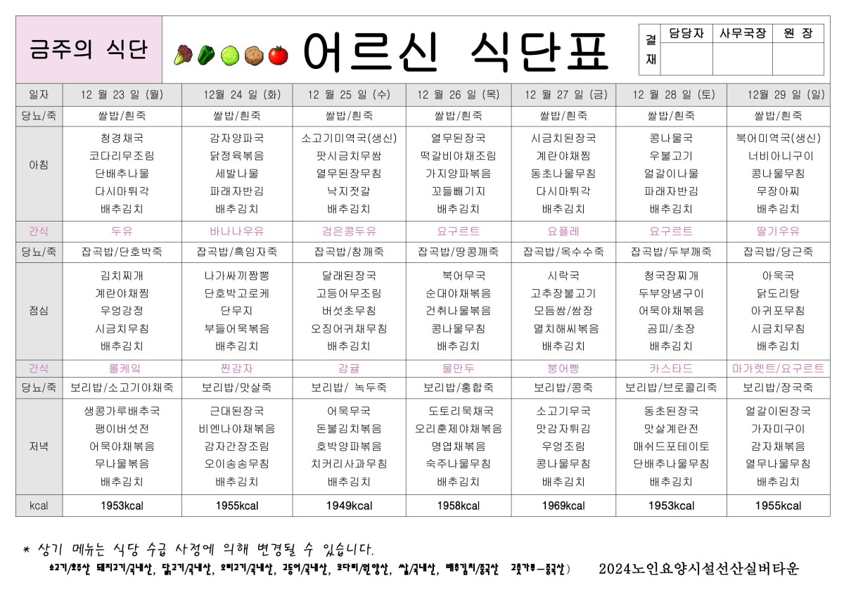 12월 4주 식단표 올려드립니다. 페이지 정보 작성자선산실버타운 등록일 2024-12-20 00:00 조회402 본문 12월 4주 식단표 올려드립니다. 목록 이전글1월 1주 식단표 올려드립니다. 24.12.26 다음글12월 3주 식단표 올려드립니다. 24.12.13