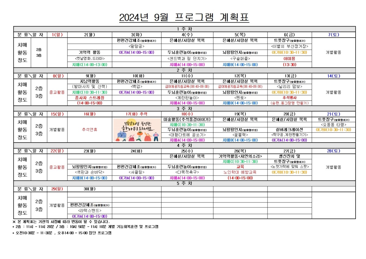 2024년 9월 프로그램 계획표 페이지 정보 작성자선산실버타운 등록일 2024-08-30 00:00 조회189 본문 목록 이전글2024년 10월 프로그램 계획표 24.09.30 다음글2024년 8월 프로그램 계획표 24.08.01